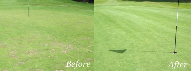 The upper profile of the picture shows a reduction of ‘thick’ layering and indicates better moisture movement. Rooting within the green has increased significantly without organic matter build up. The improvement in the greens condition, better drainage, firmness, lack of disease, better colour, no artificial plant growth regulator use, very moderate top dressing use has been achieved using Terralift.